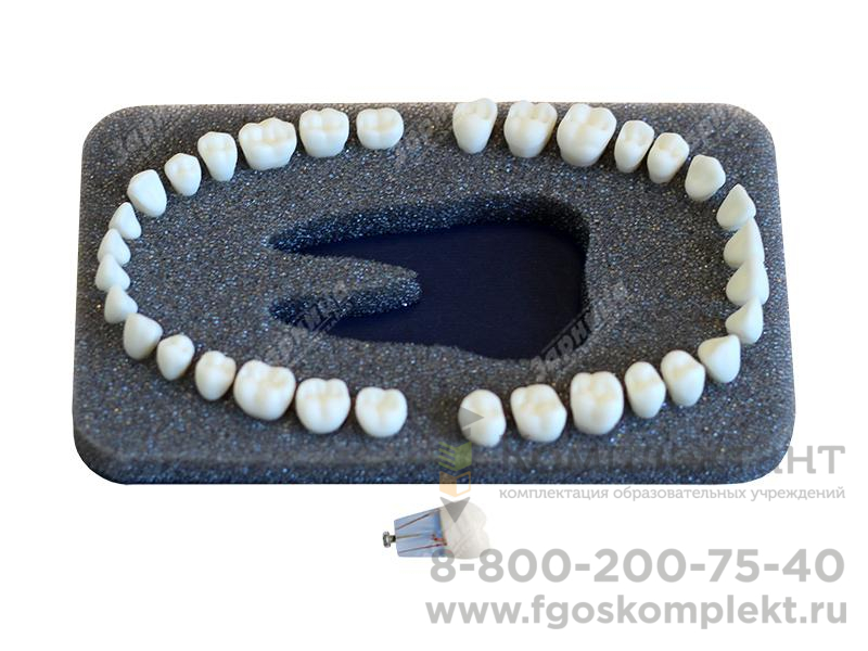 Представляет собой комплект из 32 модельных зубов естественной формы, прозрачных на уровне корня, с корневыми каналами, окрашенными в красный цвет.